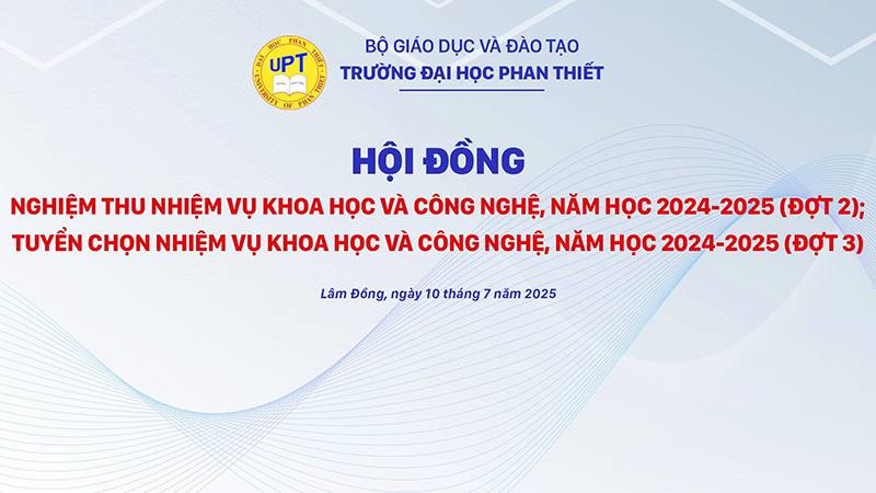 Chiều ngày 10/7/2025 (thứ 5), tại phòng họp 205, Trường Đại học Phan Thiết đã tổ chức Hội đồng nghiệm thu Nhiệm vụ Khoa học và Công nghệ, năm học 2024-2025 (Đợt 2), Hội đồng tuyển chọn Nhiệm vụ Khoa học và Công nghệ, năm học 2024-2025 (Đợt 3) theo Quyết định số 313/QĐ-ĐHPT ngày 02/7/2025 của Hiệu trưởng Trường Đại học Phan Thiết.