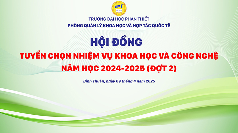Chiều ngày 09/4/2025 (thứ 4), tại phòng họp 205, Trường Đại học Phan Thiết đã tổ chức Hội đồng tuyển chọn Nhiệm vụ Khoa học và Công nghệ, năm học 2024-2025 (Đợt 2) theo Quyết định số 140/QĐ-ĐHPT ngày 21/3/2025 của Hiệu trưởng Trường Đại học Phan Thiết.