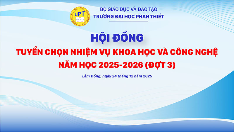 Chiều ngày 24/12/2025 (thứ 4), tại Phòng họp 205, Trường Đại học Phan Thiết đã tổ chức Hội đồng tuyển chọn nhiệm vụ khoa học và công nghệ, năm học 2025-2026 (Đợt 3) theo Quyết định số 651/QĐ-ĐHPT ngày 16/12/2025 của Hiệu trưởng Trường Đại học Phan Thiết.