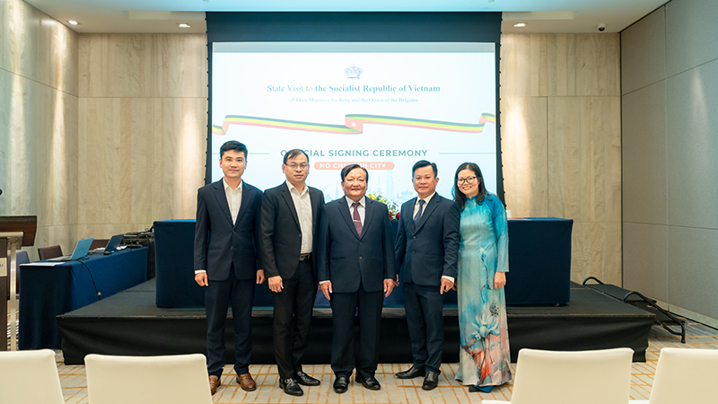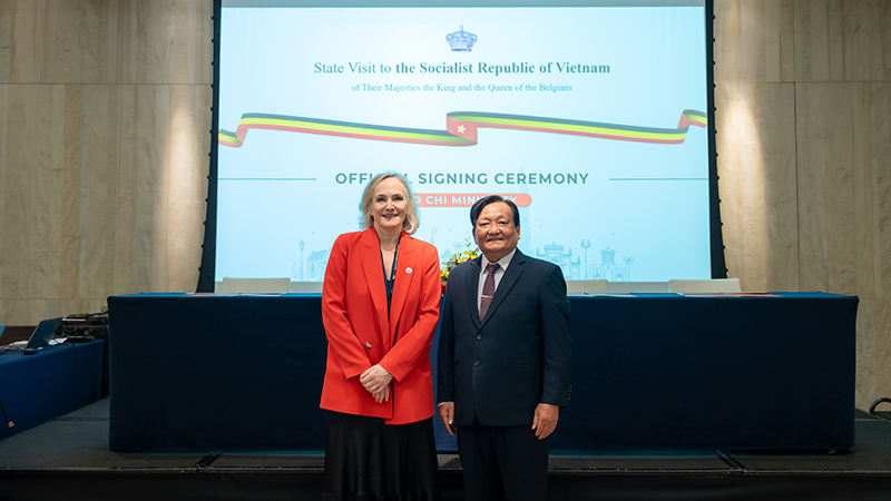 Ông Adrien DOLIMONT - Bộ trưởng Thủ hiến Wallonie (Hàng đầu tiên, thứ năm từ trái sang) và Bà Cieltje VAN ACHTER - Bộ trưởng phụ trách về Bruxelles và Truyền thông vùng Flandres (Hàng đầu tiên, thứ sáu từ trái sang) tham dự Lễ Ký kết