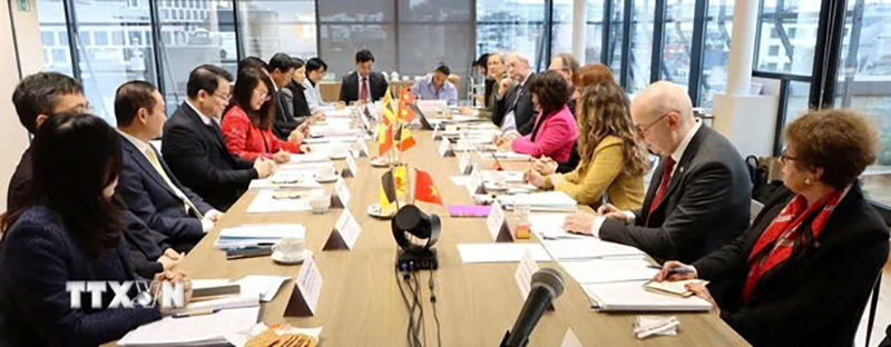 Kỳ họp lần thứ 12 của Ủy ban Hỗn hợp Thường trực giữa Chính phủ Việt Nam với Cộng đồng nói tiếng Pháp của Bỉ, vùng Wallonie và Ủy ban Cộng đồng tiếng Pháp vùng thủ đô Bruxelles (Ảnh: Hương Giang/TTXVN)