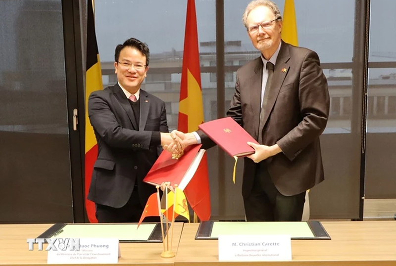 Thứ trưởng Bộ Kế hoạch và Đầu tư Trần Quốc Phương và ông Christian Carette, Tổng Thanh tra, Cơ quan ngoại giao Wallonie-Bruxelles (WBI) ký biên bản hợp tác giữa Việt Nam và vùng Wallonie-Bruxelles giai đoạn 2025-2027 (Ảnh: Hương Giang/TTXVN)